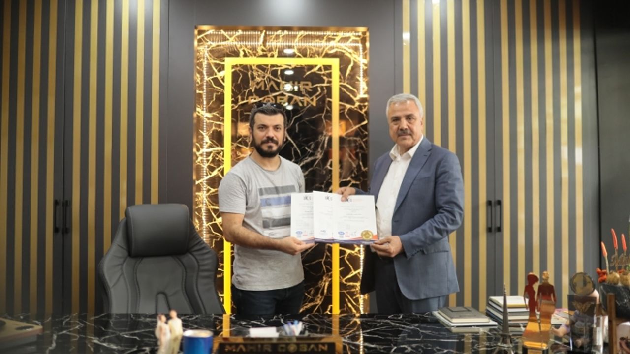 Belgeleri Şanlıurfa Ticaret ve Sanayi Odası Başkanı Halil Peltek, Mahir Çoban'a ofisini ziyaret ederek bizzat takdim etti.